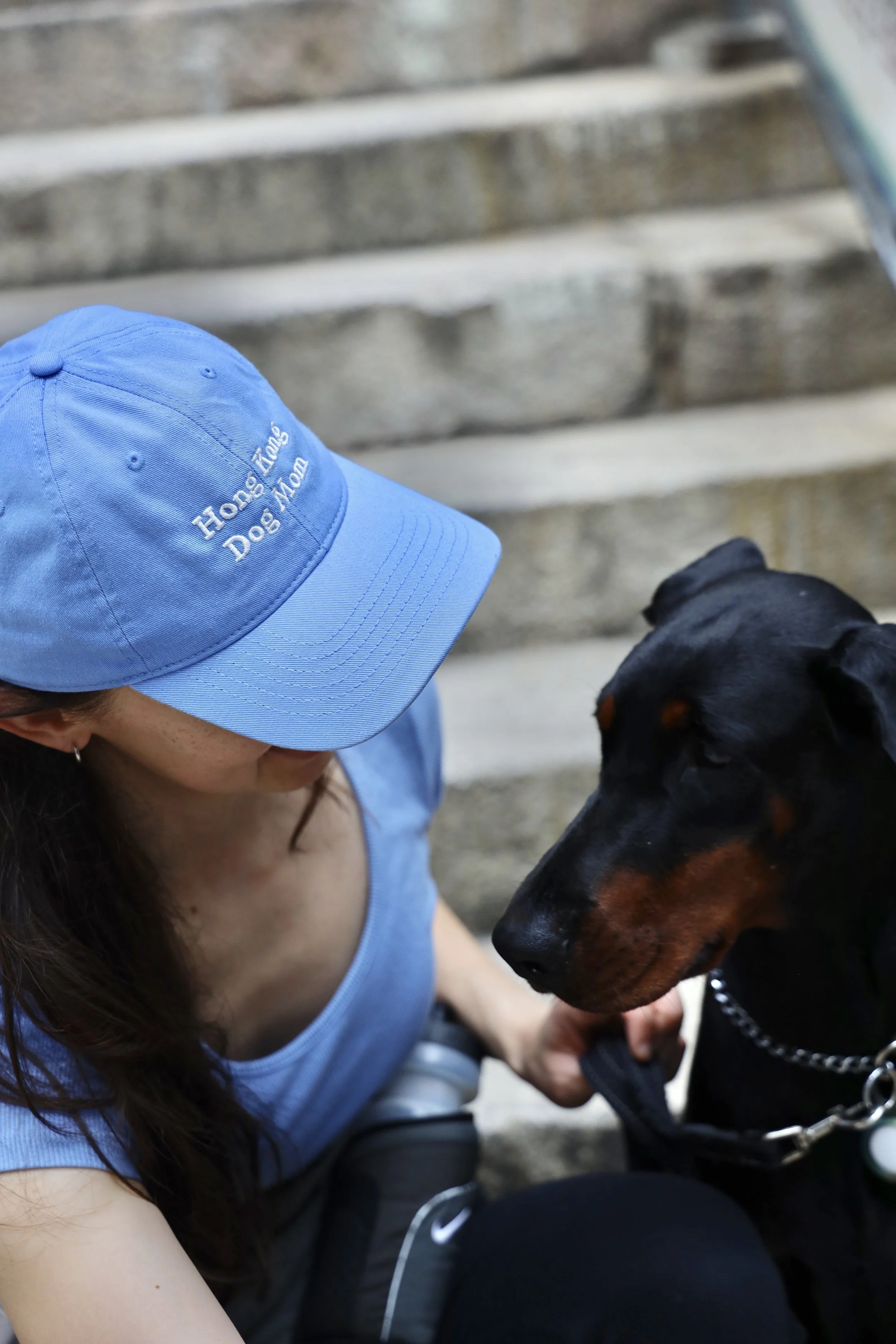 Woman wearing a blue "Hong Kong Dog Mom" cap sitting with a Doberman on steps.